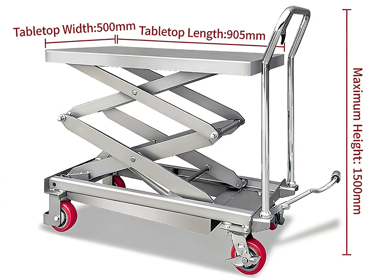 350kg 스테인리스강 유압 리프팅 플랫폼 트럭을 사용할 때마다: 플랫폼과 시저 암에 변형과 균열이 있는지 확인하고 모든 나사가 단단히 고정되어 있는지 확인하십시오. 바퀴가 부드럽게 회전하고 브레이크가 효과적인지 확인하십시오. 2~3회의 무부하 리프팅 작업을 수행하여 안정적인 리프팅, 오일 누출 없음, 하강 제어 가능 여부를 확인합니다.
